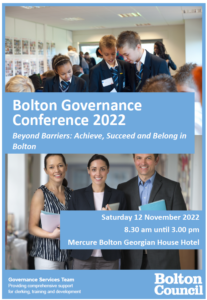The Bolton Governance Conference is to be held on Saturday 12 November 2022 from 8.30 am until 3.00 pm at Mercure Bolton Georgian House Hotel, Blackrod, Bolton. Registration will commence at 8.30 am with breakfast refreshments served. A light lunch will also be provided as part of the programme. The theme of the conference for this year is “Beyond Barriers: Achieve, Succeed and Belong in Bolton” and links with a number of key strands in the 2022 Schools White Paper, ‘Opportunity for all: strong schools with great teachers for your child’ which sets out the Government’s vision for education. Every child, no matter their background, needs or where they live, deserves an excellent education and the opportunity to fulfil their own potential, make the most of their talents and lead happy, fulfilled and successful lives.
